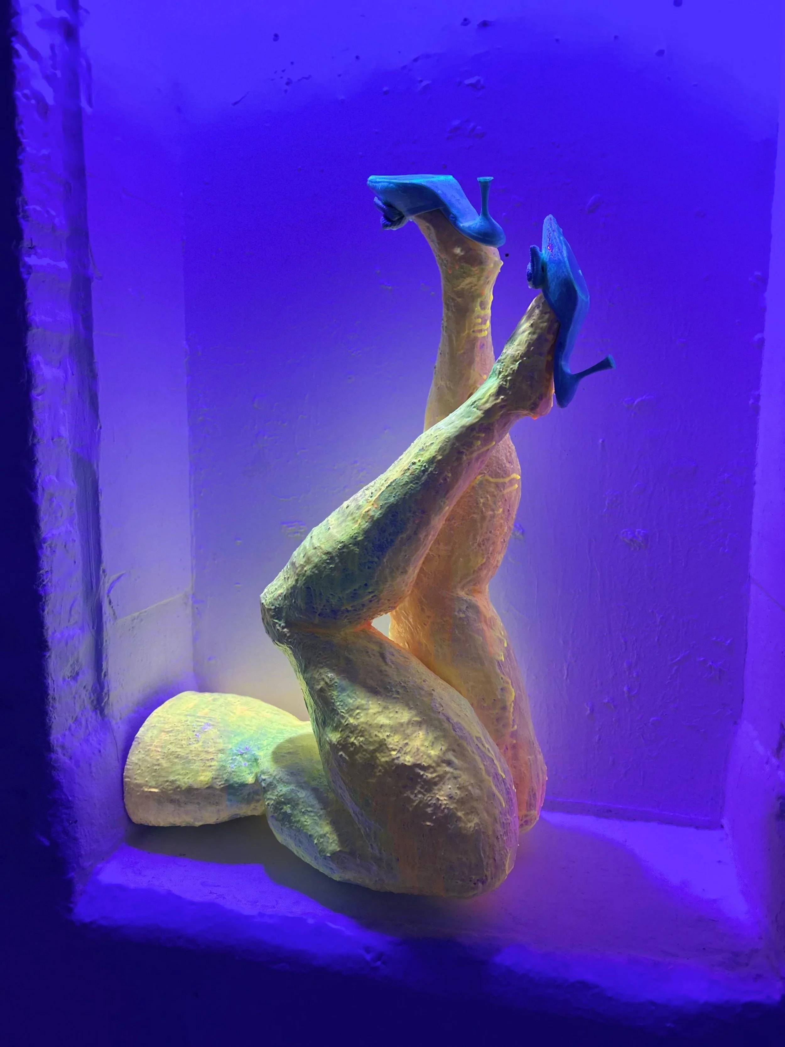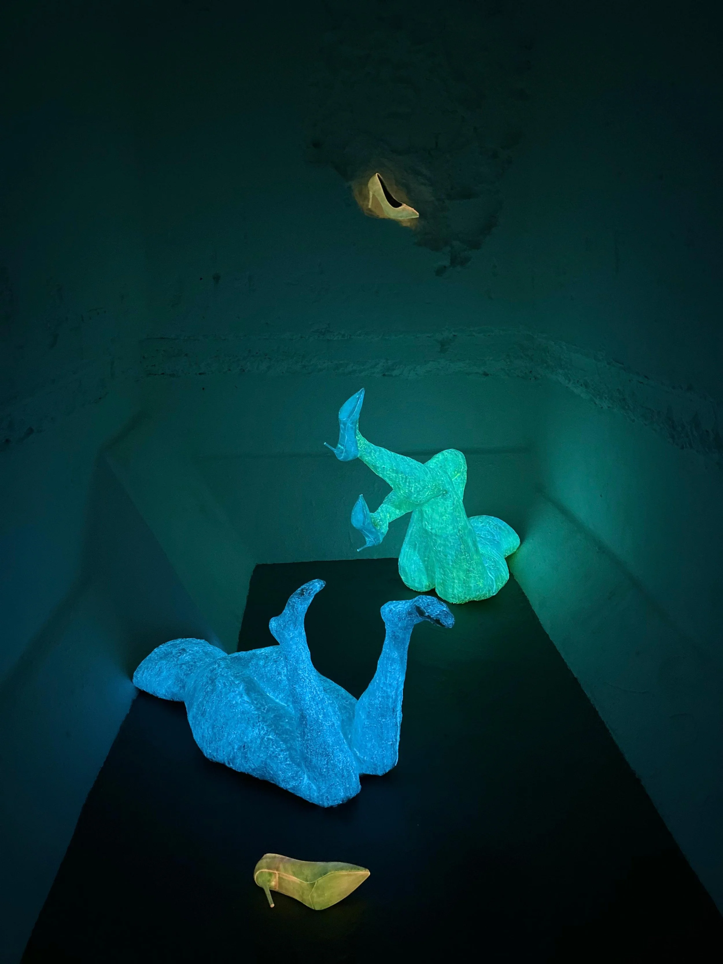 In a darkened corner of the MA Degree Show space, Amy Kaluzhny’s luminous sculptures glow with uncanny presence. Shaped like human legs mid-fall — often with high heels still attached — her fluorescent figures are witty, strange, and full of narrative potential.