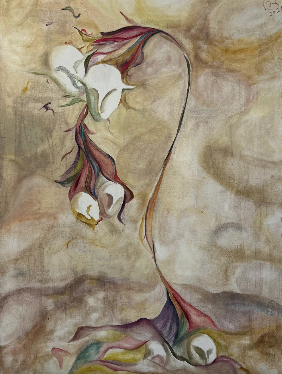 In the second piece, Zheng shifts to softer tones with a beige background. Here, six white masks float across the canvas. They link together in a flower-like organism. The shapes are fluid and elegant, showing a quieter side of his style. This contrast between vivid and subtle helps reveal Zheng’s versatility. His art seems to explore identity and nature with equal care.