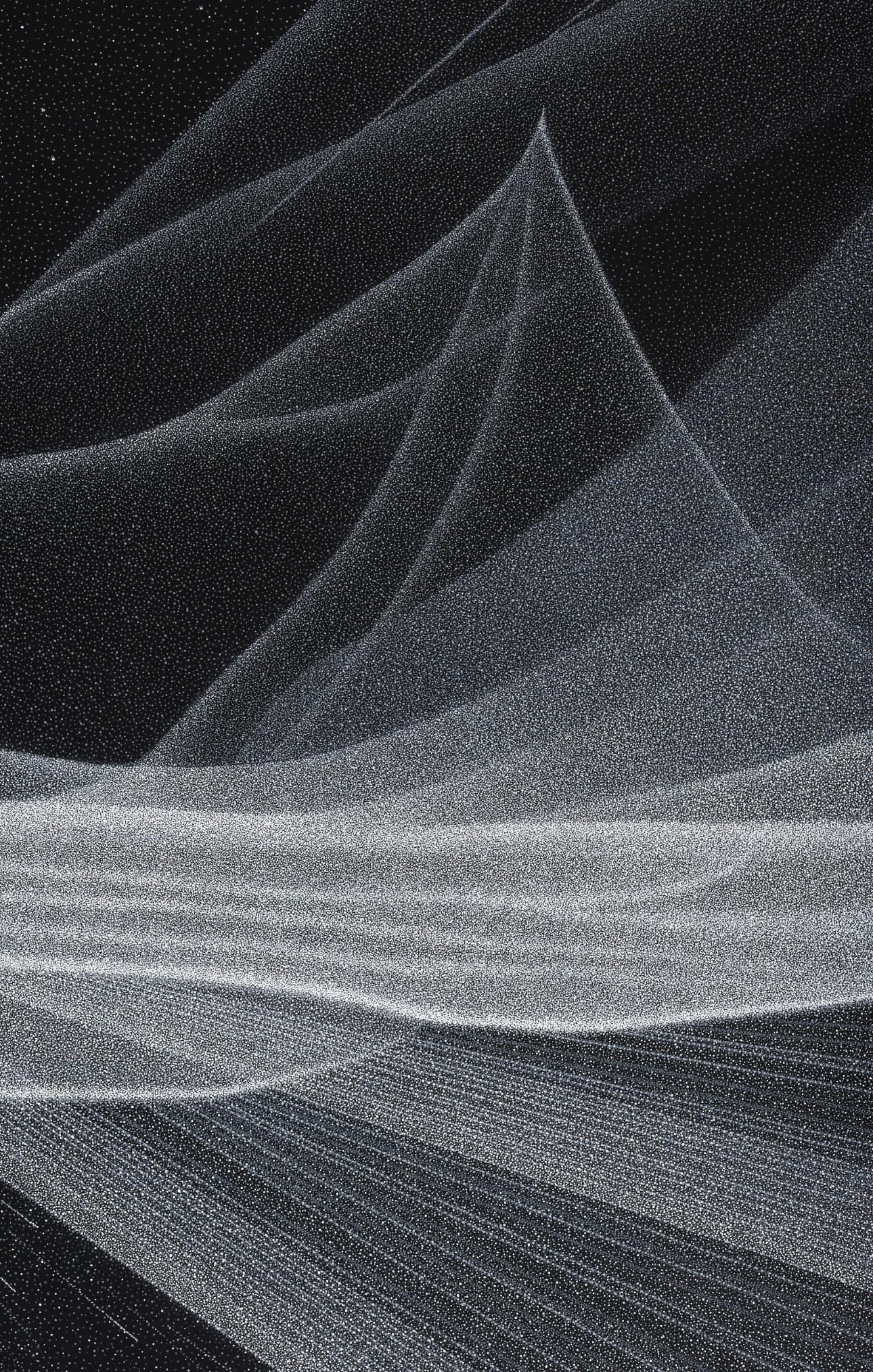 She draws on historic influences like Giacomo Balla, who expressed motion through abstraction and rhythmic repetition. Dwek also looks to the blurred imagery of photographers such as Hiroshi Sugimoto and Alexey Titarenko, as well as artist Julie Mehretu, whose compositions pulse with kinetic energy.